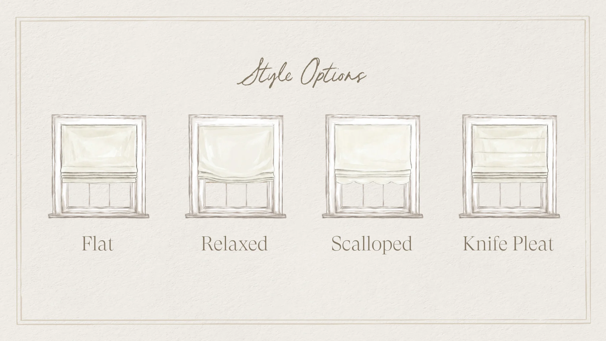 We offer Classic Flat, Scalloped, Relaxed and Knife Pleat. Check out our Roman Shade Construction Overview for more info on each look!