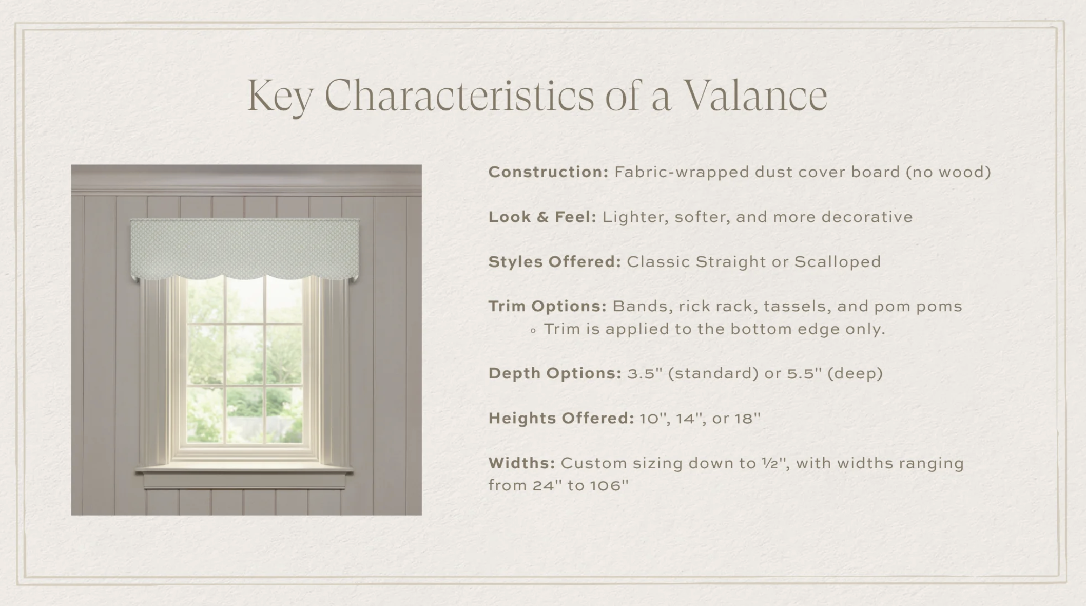 A valance is a softer, more decorative window treatment that offers flexibility in both style and trim. Valances are made from fabric-wrapped dust cover board with no wood, making them lighter in weight than cornices. This lighter construction allows for more decorative shaping and detailing, giving valances a relaxed, versatile feel. Valances work beautifully in spaces where you want softness and charm—bedrooms, kitchens, or casual living areas.