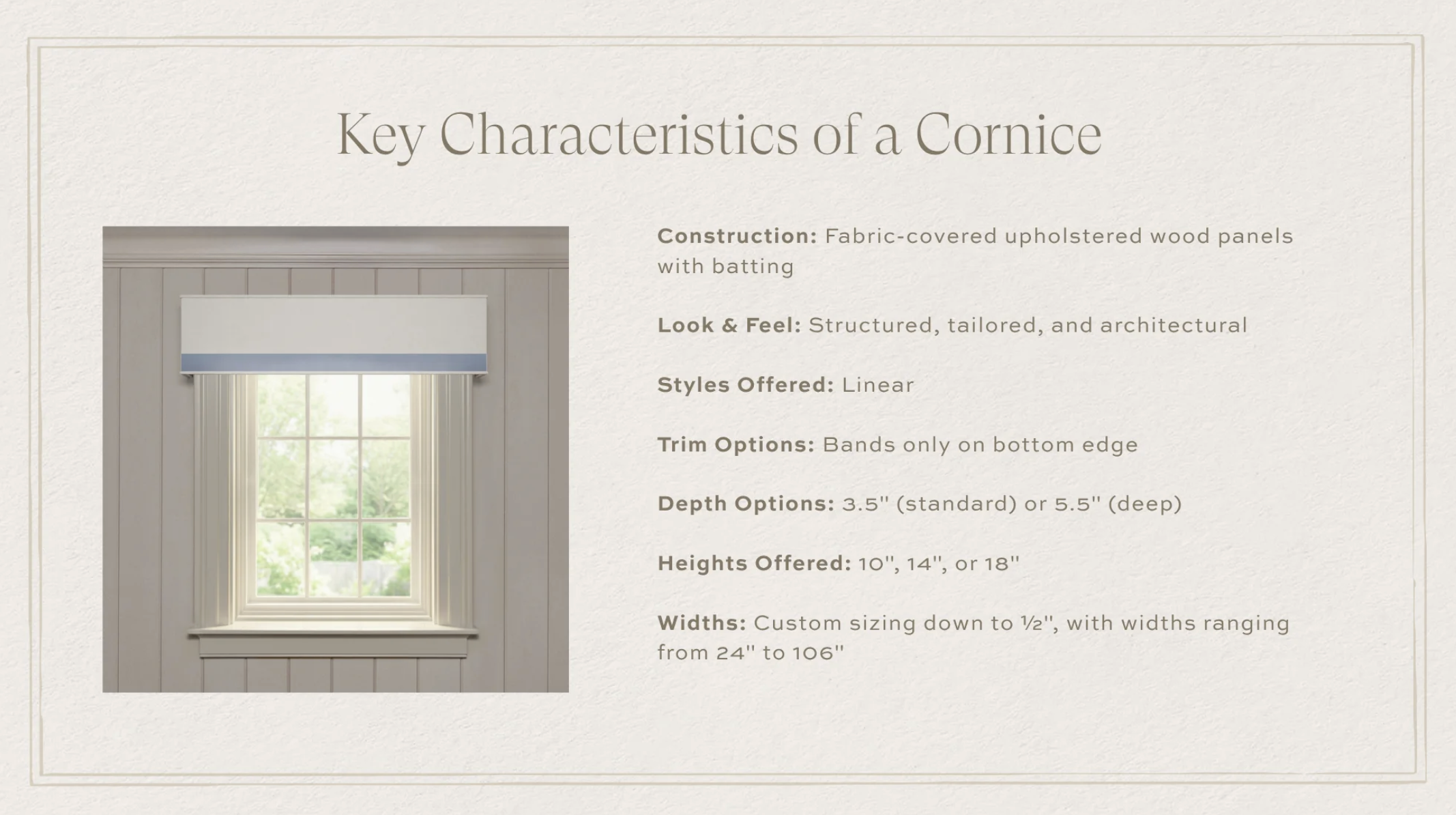 A cornice is a structured, architectural window treatment that creates a clean, tailored look. Cornices are made from fabric-covered upholstered wood panels with batting, giving them a heavier weight and a more high-end, substantial feel. Because of their solid construction, cornices sit firmly above the window and create strong visual lines—perfect for spaces where you want a crisp, custom finish. Cornices are ideal for rooms where you want a bold, polished statement—think dining rooms, living rooms, or anywhere you want a more formal, elevated look.